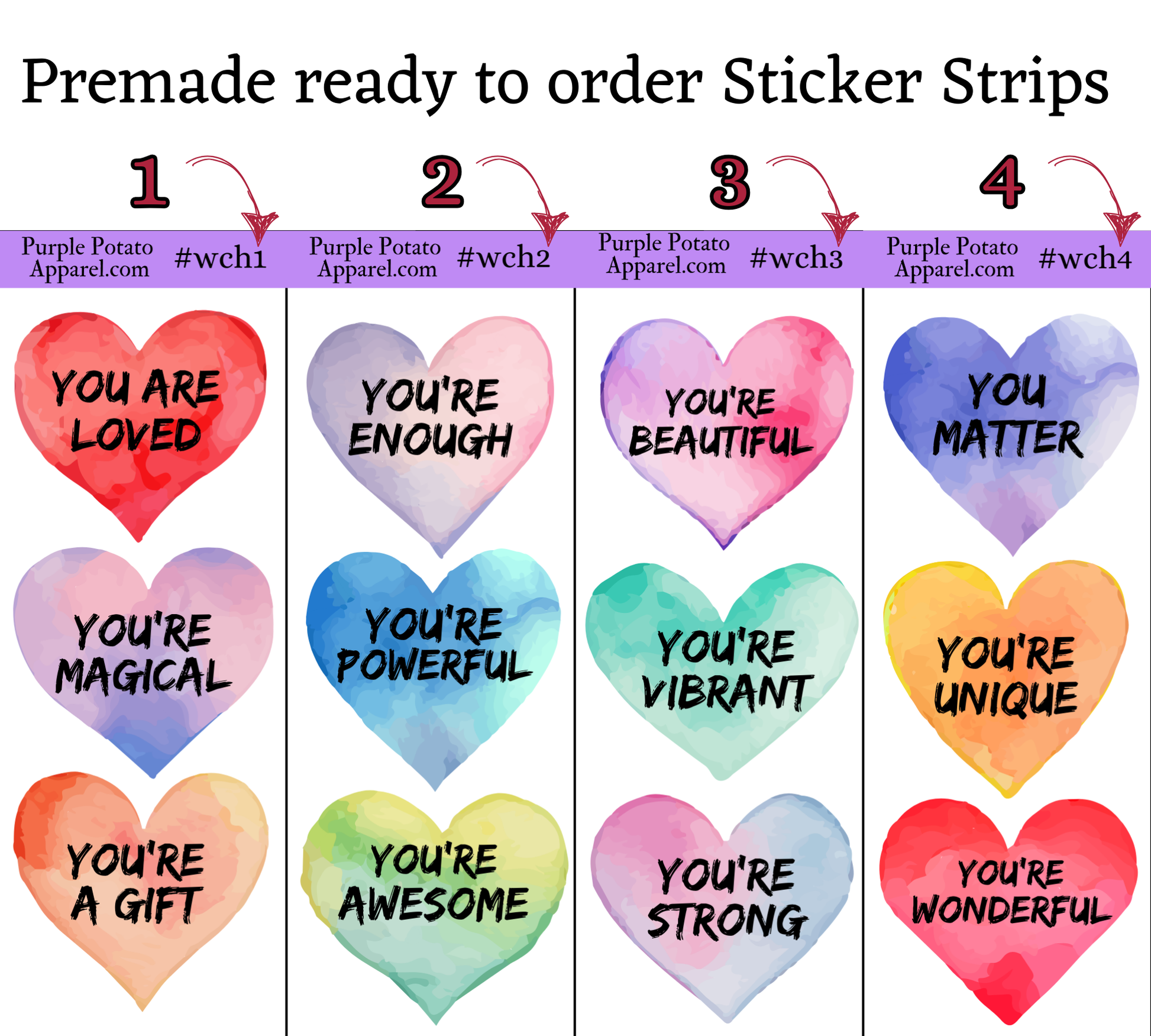 Customizable Watercolor Heart Stickers Strips Or Pre-made Positive, Feel Good Stickers.