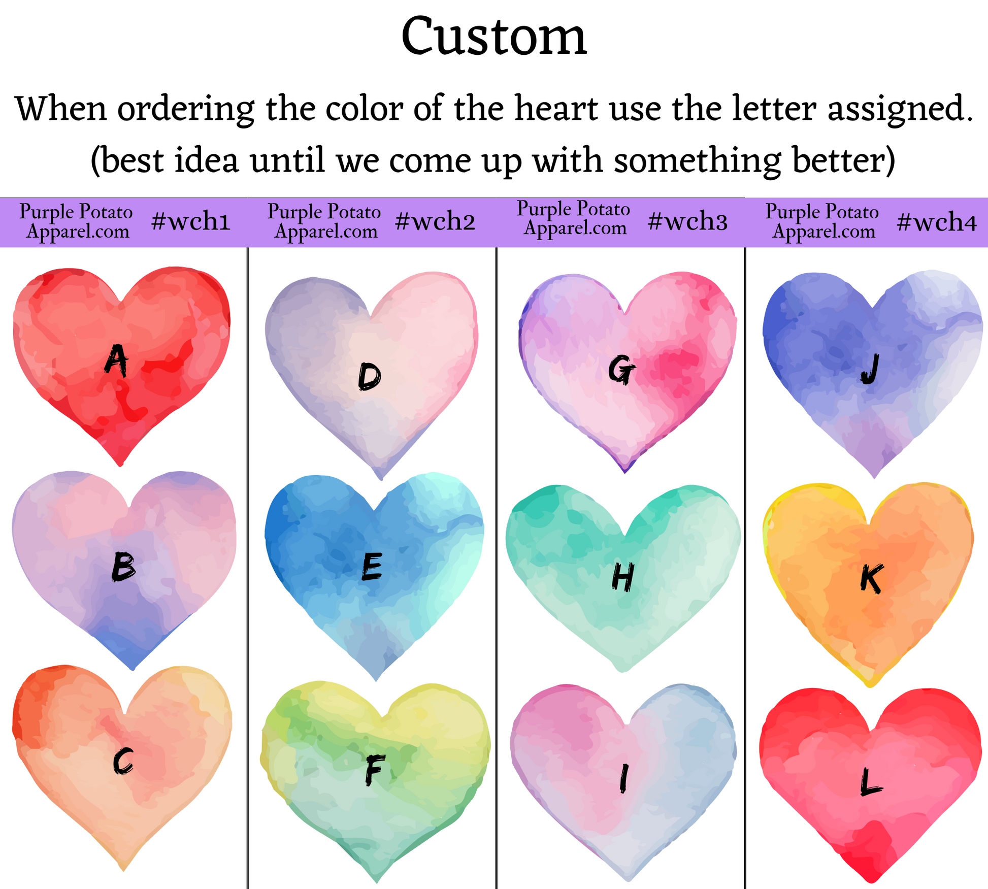 Reference "custom" photos with the assigned letter for color choice.