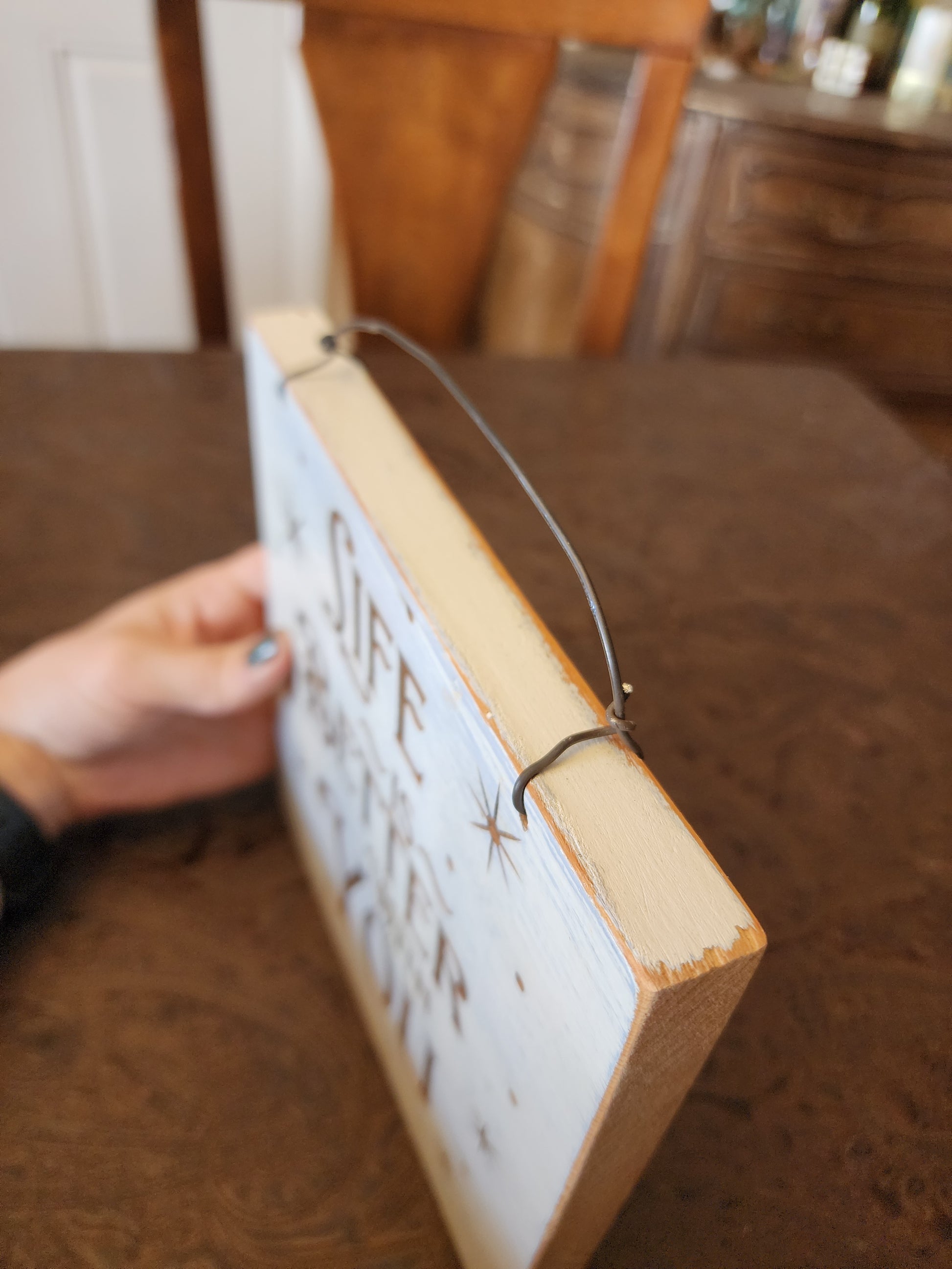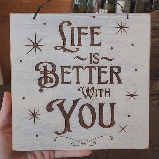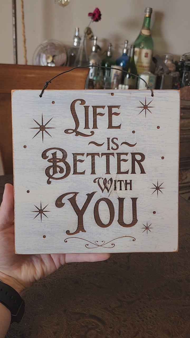 Cheery Positive Wood Sign. White paint, blue undertone, and clear coated. It says "Life is Better with You". It has a wire for hanging. The wood is upcycled from a pantry demo. Thank you for looking!