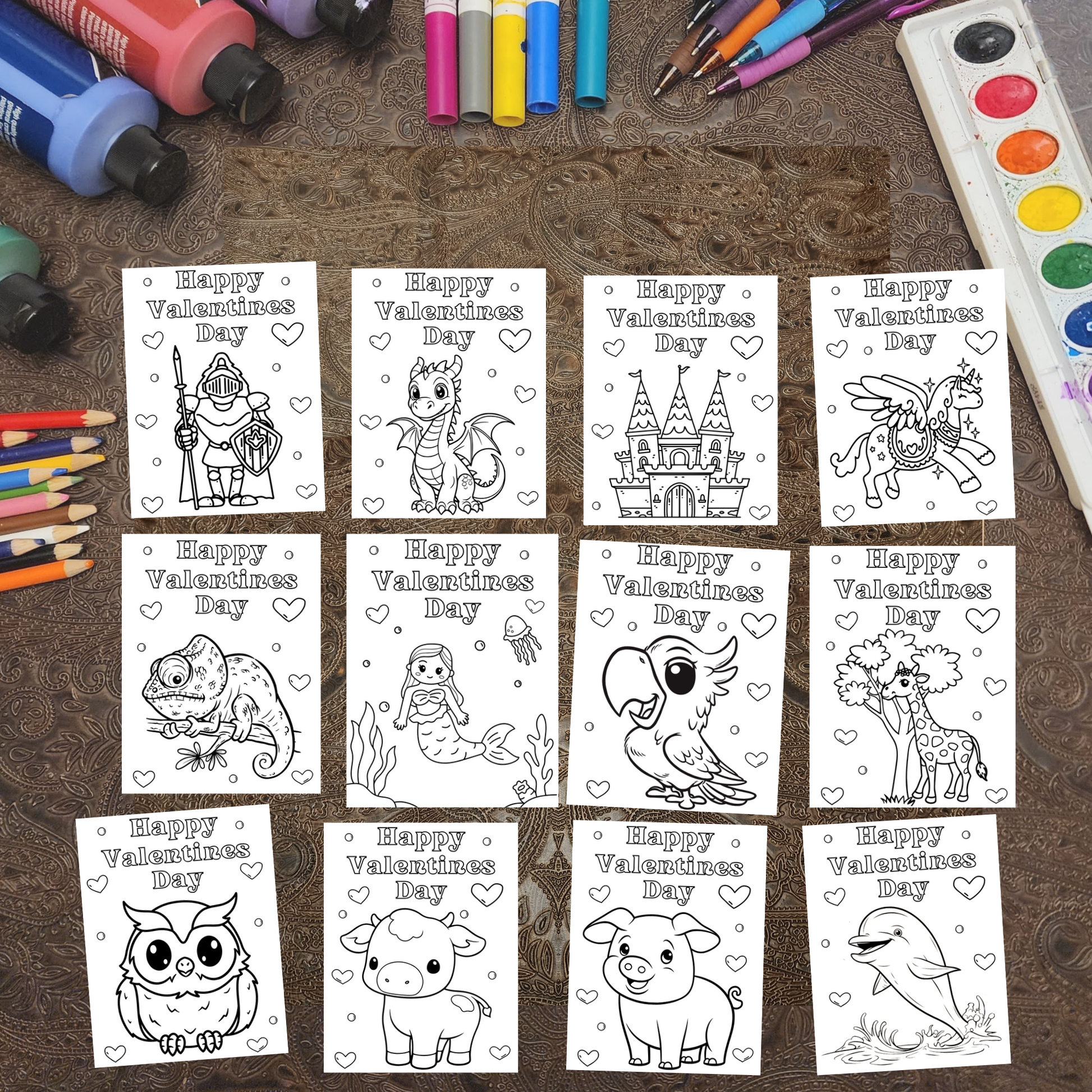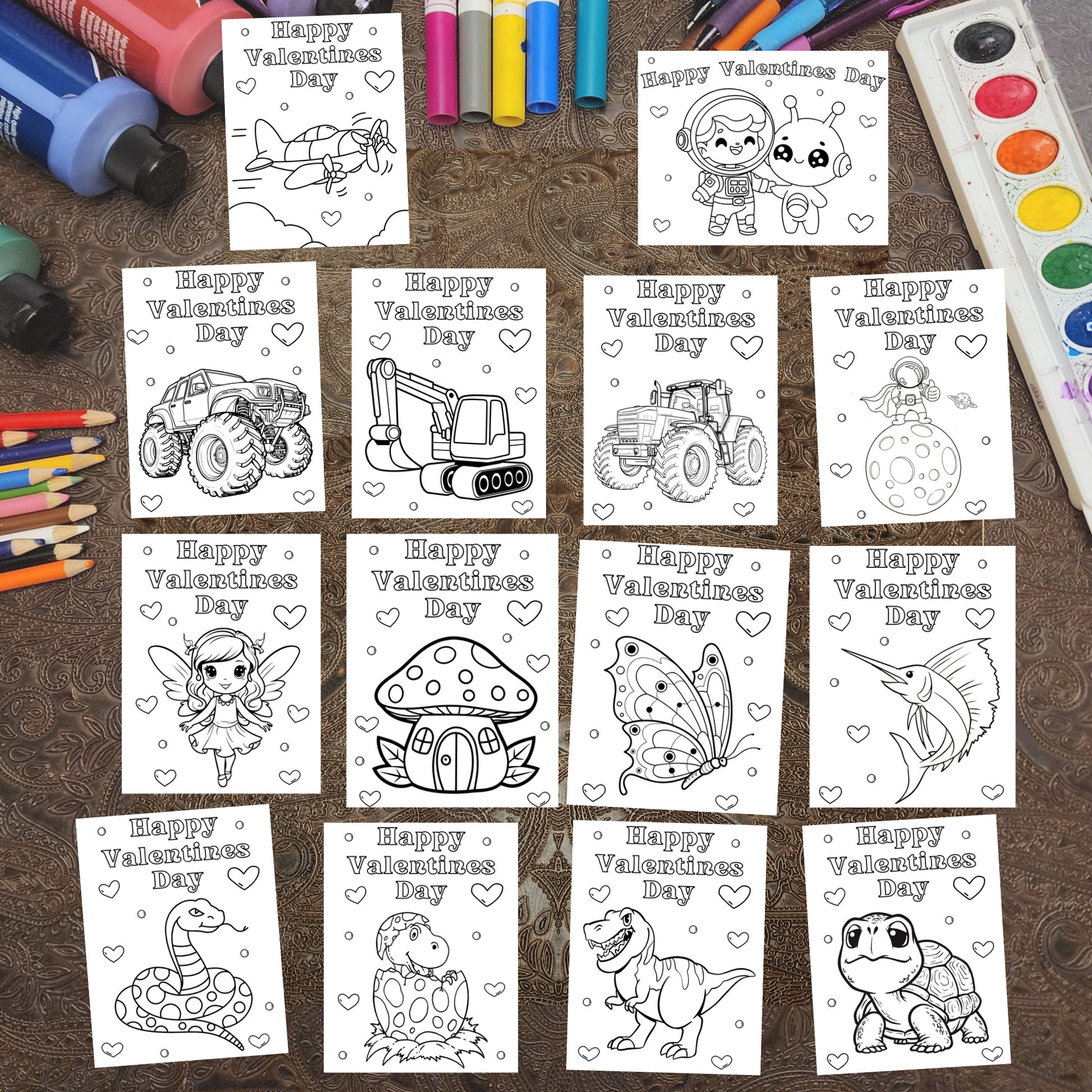 Valentine Kit. Coloring Night. 50+ Design options. 4 items: Crayons, Sticker, Valentine, Envelope.