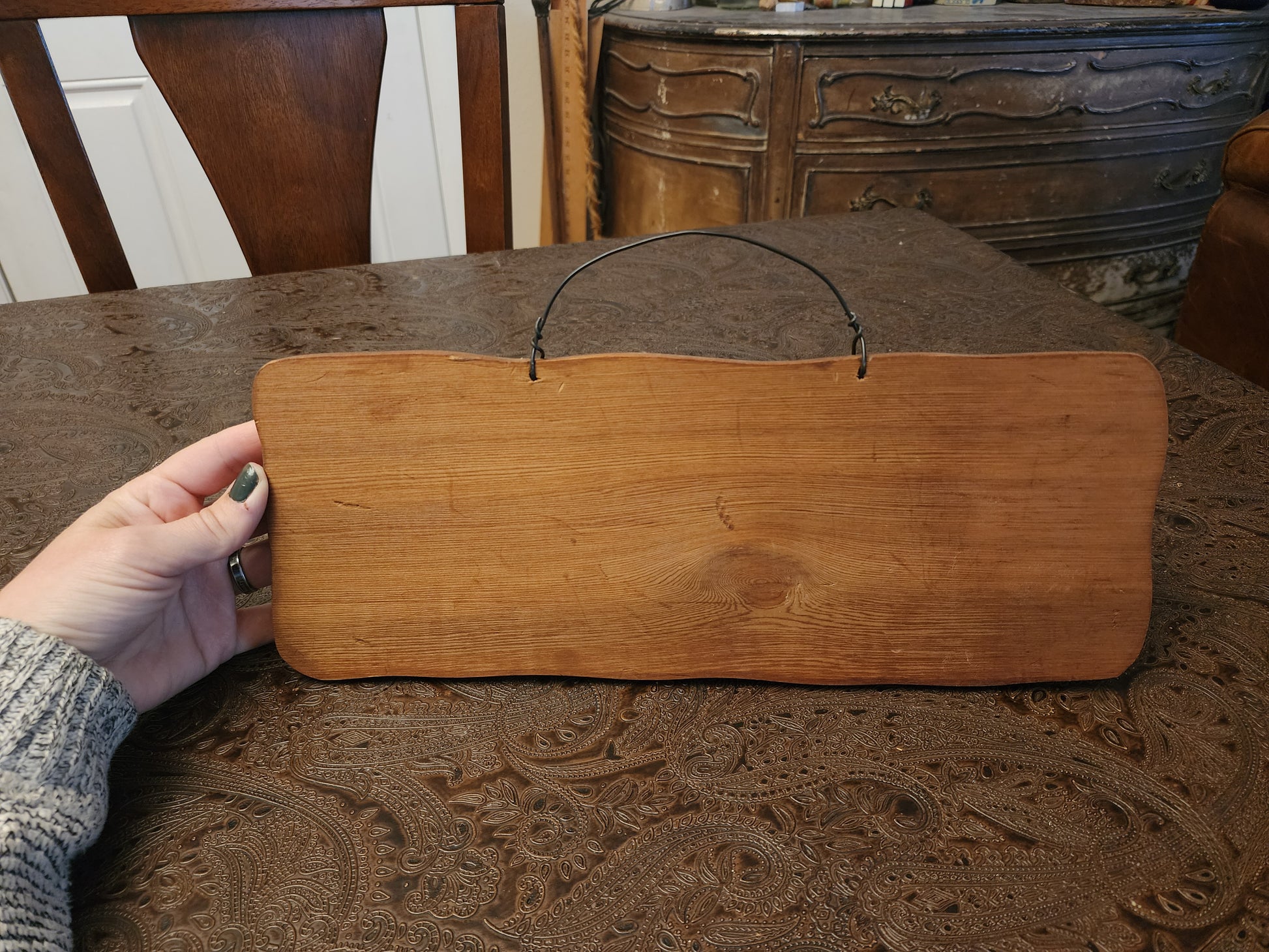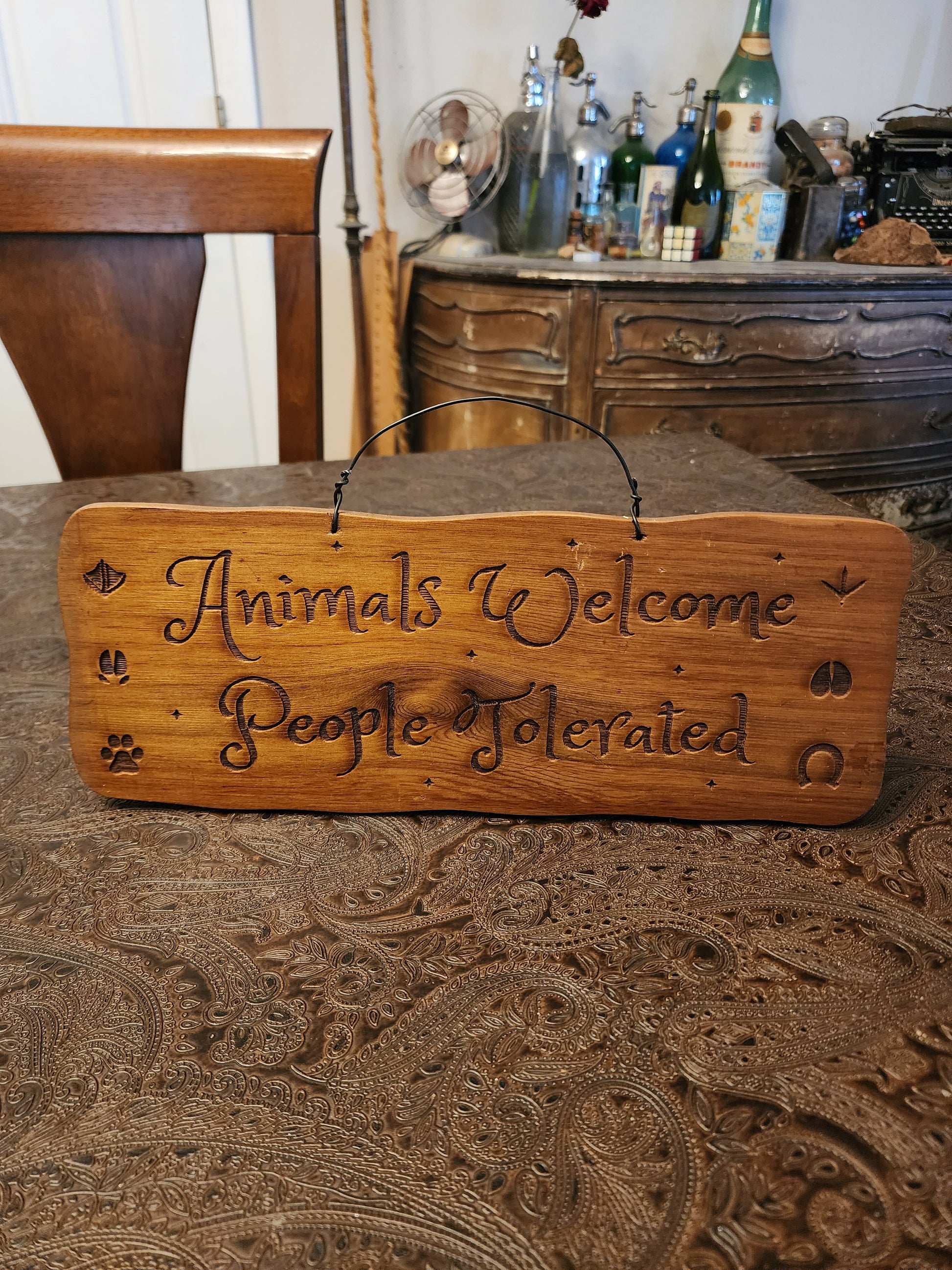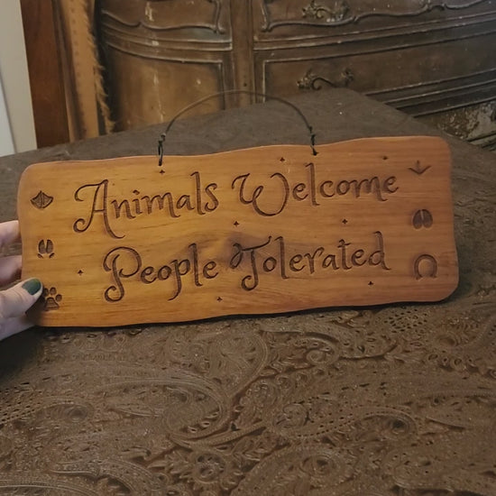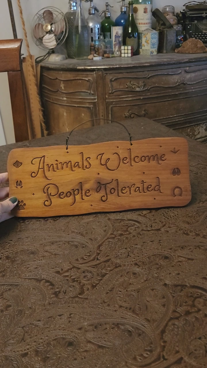 This sign is stained and clear coated and says "Animals Welcome People Tolerated". It has a wire for hanging. The wood is upcycled an old drawer. Thank you for looking!