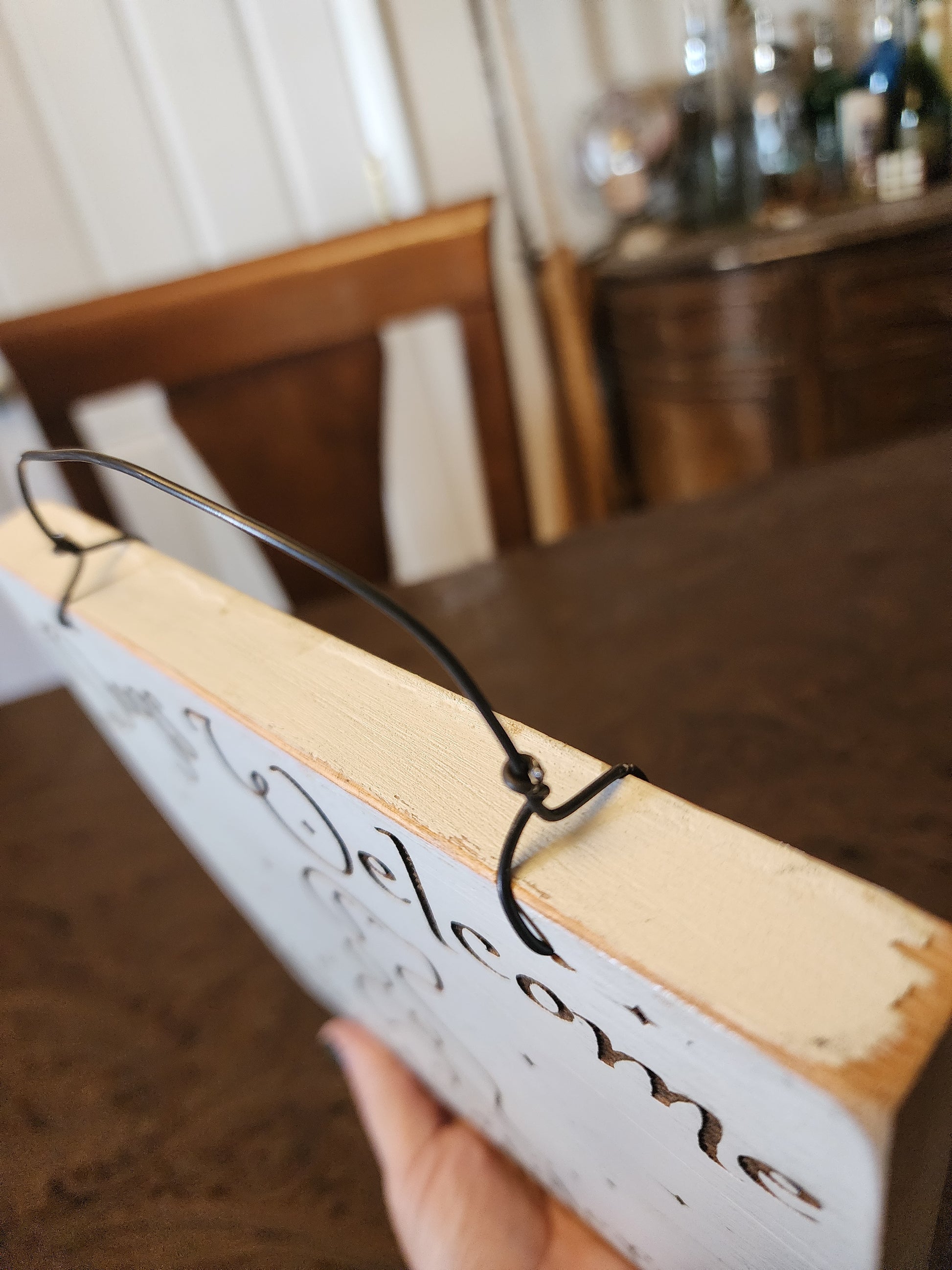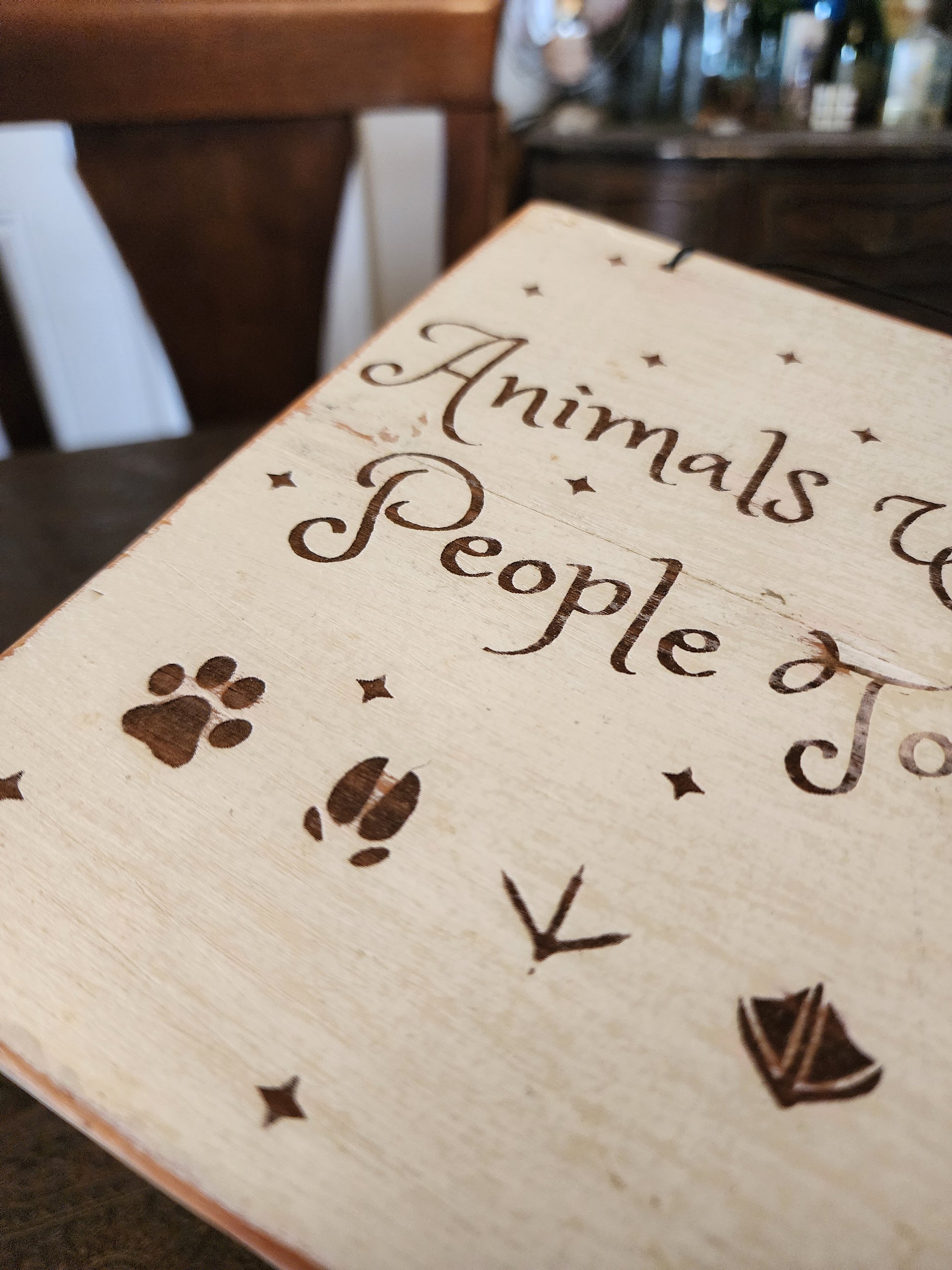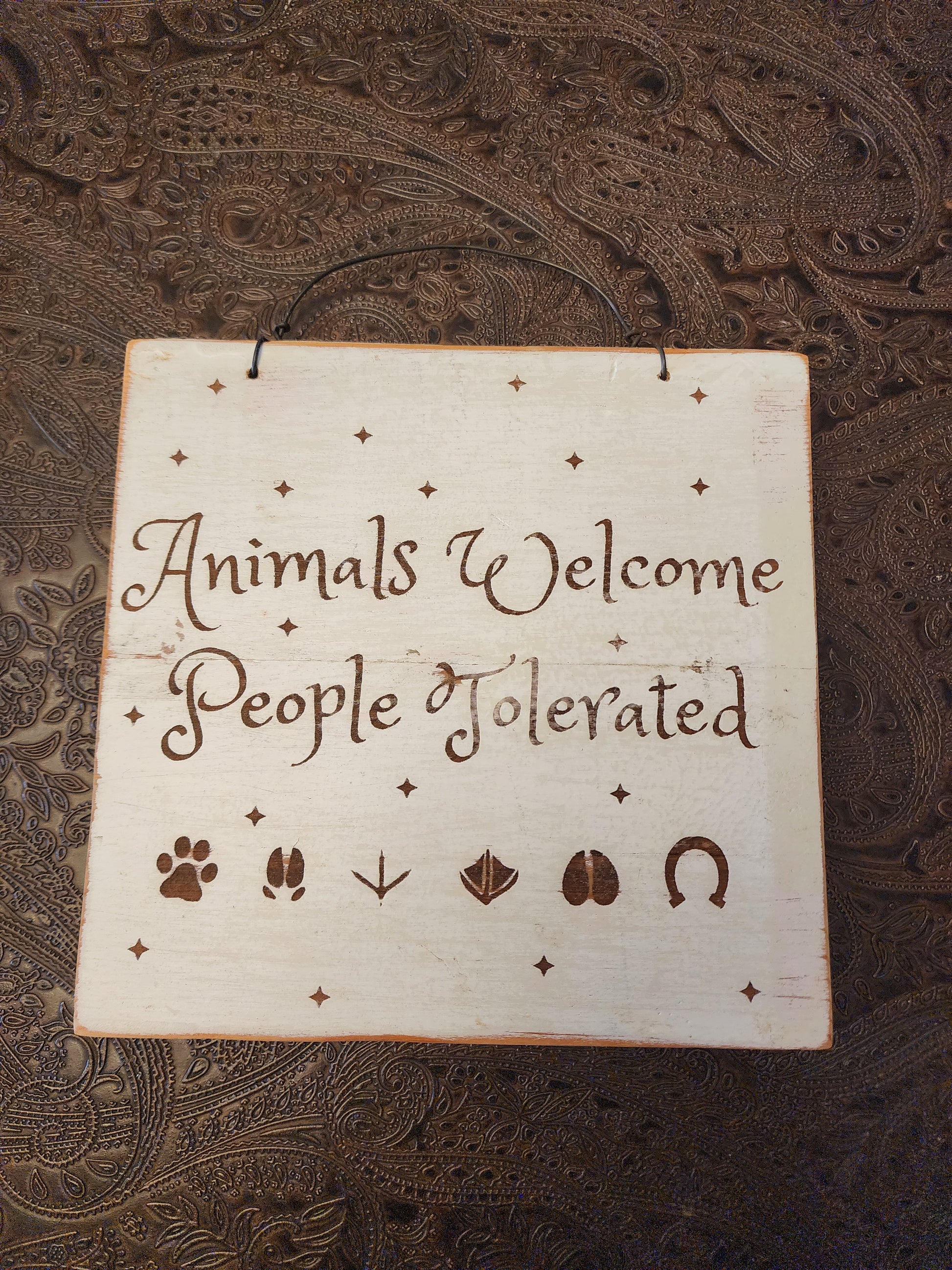 This sign is double sided, stained and clear coated. It says "Dogs Welcome People Tolerated" and "Animals Welcome People Tolerated". It has a wire for hanging. It had a crack that has been fixed and is stronger then before. The wood is upcycled from a pantry demo. Thank you for looking!