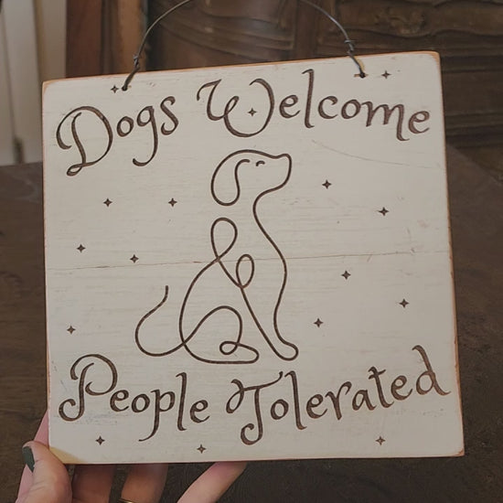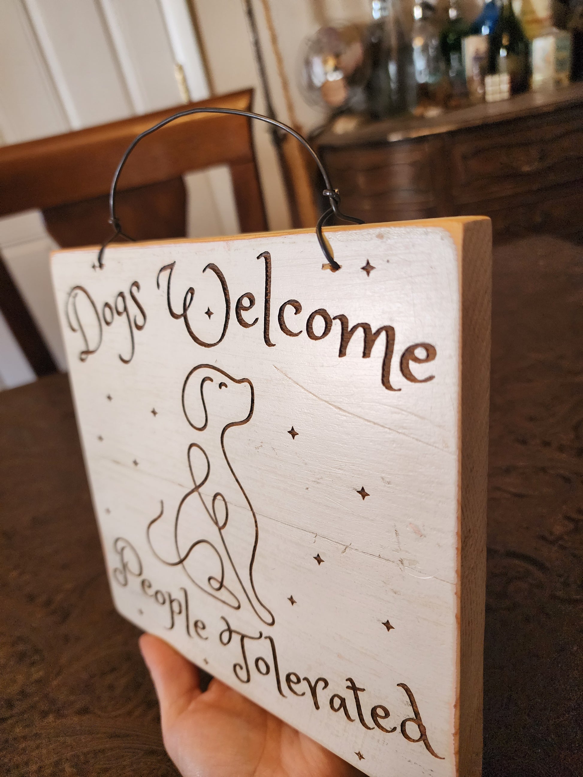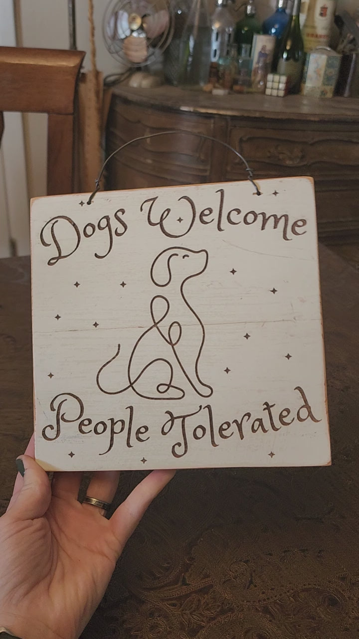 Wood Sign, Upcycled, Handmade. Double sided. One line/script dog. "Dogs Welcome People Tolerated"